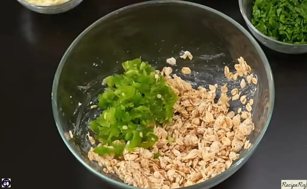 1. यदि आप रोल्ड ओट्स उपयोग कर रहे हैं तो उन्हें मिक्सी में थोड़ी-देर (पल्स) चलाकर थोड़ी बारीक कर लें — बहुत पाउडर न बनाएं; हल्का ग्रिट रहेगा तो अच्छा क्रंच मिलेगा। (यदि क्विक ओट्स हैं तो सीधे इस्तेमाल कर सकती हैं।)